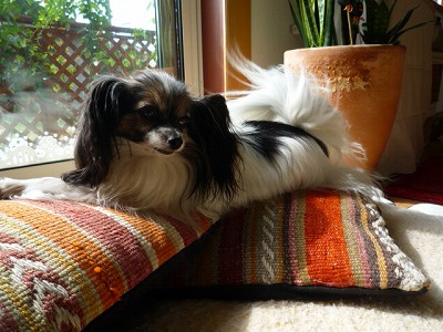 我家の姫様、swで疲れた体を癒しております。太陽光を少しでも近くで浴びるため、クッションの真上に横たわっております。しかも、二個使いで☆ママ、今日は薄手の長袖じゃ暑かったけど★どうしてワンコのちゃーむ姫はお日様がガンガン当たる場所で過ごせるの?!暑がりのあっしゅは、我家一涼しい場所で寝てましたが・・・。今日、ちゃーむが使っていたクッション。キリムのクッションカバー、手頃なお値段なので、ついつい買ってしまいます。これ以上、増えたって、置く場所がないんだけど~↓オールドキリムクッションカバー40×40(通常価格\4,500)