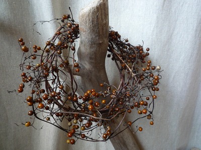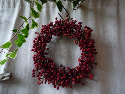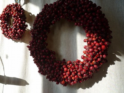 野バラのローズヒップが、あまりにも綺麗だったから。お散歩途中に寄り道して、たくさん摘み取って来ました。乾燥もすすんだことだし。台風で雨が降ってるし。今日は1日暇だから。本格的(?)リース作りに挑戦!!作り方は超自己流です。多分アケビと思われるツルをくるくるっと丸めて。細かく分けたノバラの実をグルーガンでくっつけて。案外、簡単にくっつくのね~って思いながらペタペタ。30分くらいで完成!!もっと、沢山つけても良かったかな?!とりあえず、慣れない作業に肩こりしてきたのでやめました(笑)う~ん。ローズヒップだけのリース。シンプルでカワィイイイイ!!またもや自己満足☆ついでにとってきた、多分、野ブドウのリース(?)も。出番待ちしてます。ツルだけなら、小庭に飾ってもいいかな~って。ちょっと癖になりそうなリース作り。そろそろ、材料集めの季節かもしれません。↓作る手間と傷だらけになることを考えたら、買った方が安い?!【40%OFF】テーブルクリスマスツリーとクリスマスリースセット★10月31日まで税、送料込みで\1980!お一人様1セット限定【新規福袋0710】