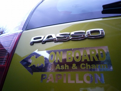 新車が来たので、愛犬の名前を入れられるステッカーを注文。届いたので~、さっそく貼ってみた。車の色が、目立つ色なので、あんまり目立たない?!目立つように、メタリックカラーのステッカーにしたんだけど・・・。実は、私がステッカーを貼るのには理由がある。我家の散歩コースまで、車で移動するのだが、帰り道、うんちを入れた袋を後のワイパーにぶら下げて走ることになる。(におわないマナーポーチ等使ったが、ほのかに香るので車中には置けない★)以前、ステッカーを貼っていなかった時のこと。信号で止まった時、「何かぶら下がってますよ~!」と優しいドライバーさんが何度となく、教えてくれたことか。。。親切な方がわざわざ降りてきて、教えてくれるのに、「ワンコのうんちなんですぅ~、すみません~、ありがとうございます~。」とっても申し訳なく思うのである。それで。「Dog in car」ステッカーを貼ったところ。皆さん、推測可能になったのか、声をかけられる率が減少したのである。それ以来、我家の車にはステッカーが必需品となったのだ。最近は名前が入れられて、色々選べて楽しいわ~。楽天でも買えるのね。↓【カッティングステッカー】パピヨン A-1 名入れタイプ (Lサイズ)