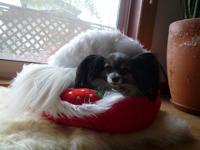 「もぐっておやすみ」が届きました~♪三色あって、どの色にしようか、かなり悩んで赤色を購入したけど。届いたら、若くない私には「う~~~ん。」って感じの赤色だったけど。「ああ、ピンクか黄色にすれば良かった。」なんて感じちゃったんだけど。凸凹はこのシェル型ベッドがお気に召した様子。こんな感じでベッドの縁を枕に寝ています。ちゃーむが入るとお尻の方はまだまだ余裕たっぷり。ですが、大き目のあっしゅには・・・。もぐっておやすみ~は無理でした★それでも、ベッドの上に乗って寝てましたから、きっと気持ちが良かったのでしょう。赤色がちょっと安っぽくてがっかりだけど。(実際高くないんだけど。)凸凹が気に入ってくれたのが何より。これから寒くなっても、フェイクファーがふたりを温めてくれそうです。思いもかけず、あっしゅがお気に召しちゃったから・・・もう1個買うべき???また、悩む~↓【送料無料】わんちゃん、ねこちゃんの為のほかほかぬっくぬっくアイテム【10/23再入荷分予約】フルーツ村のペットたち もぐっておやすみ
