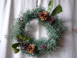 雨が降って凸凹の散歩がお休みで時間があまったので。庭のコニファー、ブルーアイスの枝を使ってシンプルリースを制作。緑の葉っぱだけだと、あまりにもシンプルだったので。海岸で採集したローズヒップと松ぼっくりをくっつけて。それでも何か足りない感じがしたので。お隣のおばちゃんからいただいた月桂樹の葉っぱをつけてみました。ナチュラルだけど、う~ん。やっぱりさみしい・・・。ラフィアのリボンとか買ってきてかけてみようかな?!これ。何の実?!ローズヒップを採取する場所にこの実も沢山あるの。はじける前に採集して、お日様にあてたら赤い実がこんにちは♪我が家は家の中も外も、なちゅらる素材たっぷり~。下手したらゴミ屋敷だけどぉ★リースを作る時もグルーガンのグルー代以外、お金もかからない~。都会に住んでいた時はこんな趣味はなかったけど。田舎に引っ込み、十年以上。田舎暮らしにどっぷり浸かっておりますぅ。。。田舎生活の必需品。長靴をさがしてたら、冬用のみつけたよ♪安い!今だけ40%オフ!大人気のおしゃれな長靴(レインブーツ)秋冬のお出かけに温かリブブーツRIB BOOTS 【ブラック・ブラウン・グリーン】【10P26Oct09】