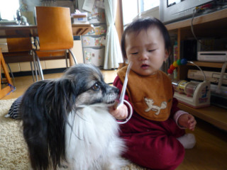 ちゃーむ、うまいこと赤ちゃんと遊んでます。赤ちゃんは手加減を知らないので、時々毛を引っ張られても、我慢。どうしても我慢できない時はぺろぺろ攻撃!赤ちゃんはぺろぺろが嫌いなので、毛を引っ張るのなんて忘れちゃいます。大好きな赤ちゃんと一緒なのに、遠巻きにしてます。あっしゅの場合、 例え引っ張られたとしても、ひたすら我慢の犬。こんなあっしゅを見てると、養護学校でボランティアをしてる姿を思い出します。今年は新型インフルエンザが流行し、ボランティア活動が中止になってます。ちゃーむのぺろぺろ癖、今のうちに直しておかなくちゃ、ボランティア活動が再開したら、問題行動だわ!何事も我慢、我慢よ~。今のうち、練習、練習。練習台に使われるのは私の妹の三番目なのでした~~~。 先日購入したベッドが千円も安くなってるぅ。。。↓なんか、くやしいよぉ・・・。フルーツ村のペットたちシリーズがベッドになりました。◎ 【ポイント10倍】 もぐっておやすみ (ペッツルート)【11月5日からの発送となります】