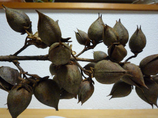 桐の実。近所にある木にたわわに実ってました。一枝、我が家にリース素材としてやってきました。桐なんて、普段、箪笥でみるくらいだから。記録として、載せておきます~。面白い構造をしています。外の堅い殻の中に柔らかめ種子らしいものがあって。それを守るためか?小さいフワフワした物がたくさん詰まってて。見れば見るほど面白い。自然って、面白い。植物の種って、面白い。な~んて、のんびり考えられるようになった私は歳をとったのかもなぁ・・・。フレッシュリースで桐の実を使った物を発見。画像を開くと、木の姿が載ってるよ♪↓クリスマスプレゼントに★お歳暮に クリスマスリース★桐の実フレッシュリース■35cm【生】【楽ギフ_包装】【楽ギフ_メッセ入力】