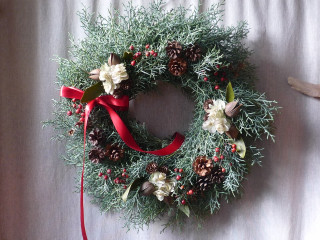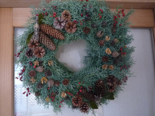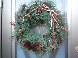 この秋、三つめの生リース、できましたぁ!今度はナチュラルな感じのまま、40センチ越えの大型タイプ。リボンはお嫁入り先で、お好みのをかけていただくことにして~。今回は、前作品以上に土台のブルーアイスを沢山、沢山つけました。手がヤニで真っ黒、べとべと・・・。石鹸では落とせません。除光液で綺麗に取れるので心配はいりませんが★ムクゲの花ガラと唐松ぼっくりは、いただきものです。これがあるおかげで、かわいらしく出来上がりました。桐の実も、野バラのローズヒップも在庫がなくなってきたので、また採集にいかなければなりません・・・。実は、このリース、厚みが8センチくらいあって、未だかつてない重さで、耐えられるか心配だったので~~~もし、壊れたらお直しをするから~と、本日手渡ししてきました。一番落ちそうなのは、大きな松ぼっくり。ドイツトウヒ??名前がよくわかりません。近所で収穫するのですが、今年はほとんどありませんでした★できる年とできない年があるのかな??・・・クリスマスが近づいています。のんびりしてられません。今度は我が家用に45センチ越え、目指して制作です!他にも作らなきゃならないので、大忙しになりそうで~す。こんな形のリース↓もステキ!色んなリースがありますね~~~。どこにも無いスタイルグラッシーズのオリジナルオススメですクリスマスリースティアドロップ玄関を素敵に飾れる全て手作りなのでお一人さま3個迄でお願い致します【楽ギフ_包装】【楽ギフ_メッセ入力】11月よりお届け致します