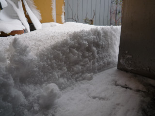 今朝、鍵を開け、ドアを開けようとしたら。ん??開かない?!思いっきり力を込めて押したら、ようやく半分開きました~。一応、玄関の外は屋根が付いてるんですが、少し雪が積もってしまった様で。やっぱり、風除室がなければ、ダメか?!ドアに飾ってあったリースも、雪が吹きつけられてました。なんとか、クリスマスまで持ちこたえてくれて良かったです。ドアチャイムの傍の「犬います」のボード。雪が吹きつけられて、ワンコが寒そう~~~。今日は、引きこもり決定です。昨日も引きこもってたけど・・・。風がやむまで、散歩はお休みです。ちびちゃん、風に立ち向かえませんから~★うちのとは違うけど、↓こんなのもかわいいし~。「猛犬注意ならぬ愛犬注意」ドアや門扉、玄関先にピッタリ☆可愛い子犬:ハウス&ドッグプレート(E984)↓これを大小揃えてもかわいいなぁ~~~。ウェルカムプレートをくわえた犬の置物・オーナメント(玄関・お庭・インテリアに)可愛い子犬:Welcomeドッグ(大/BE7601)