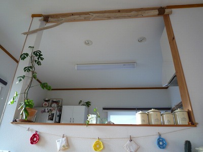 対面式キッチンのカウンターの上にくくりつけてある流木。