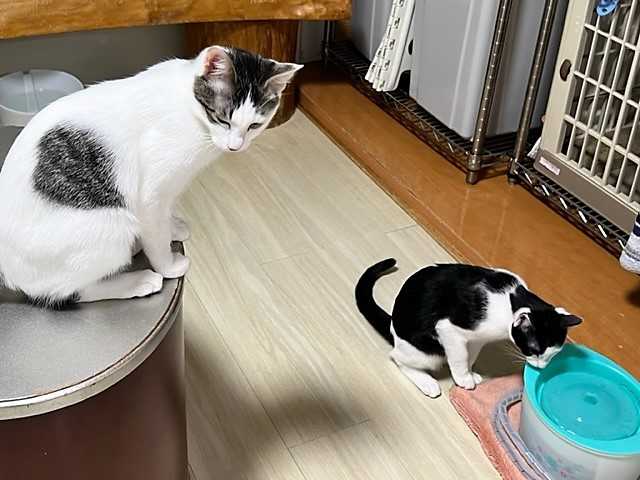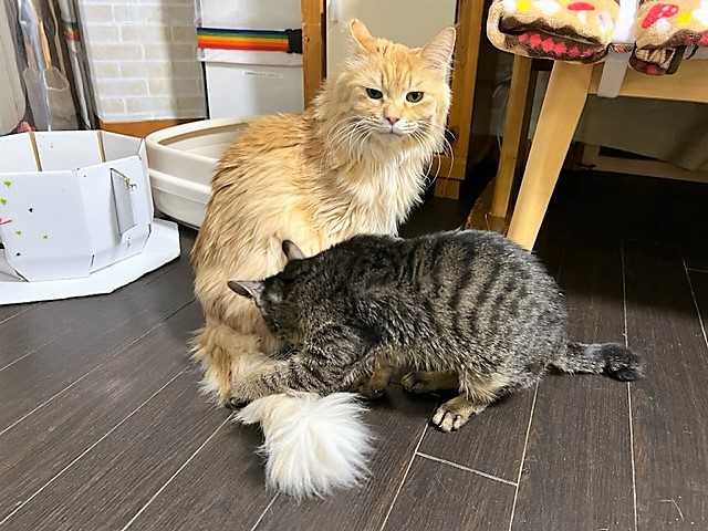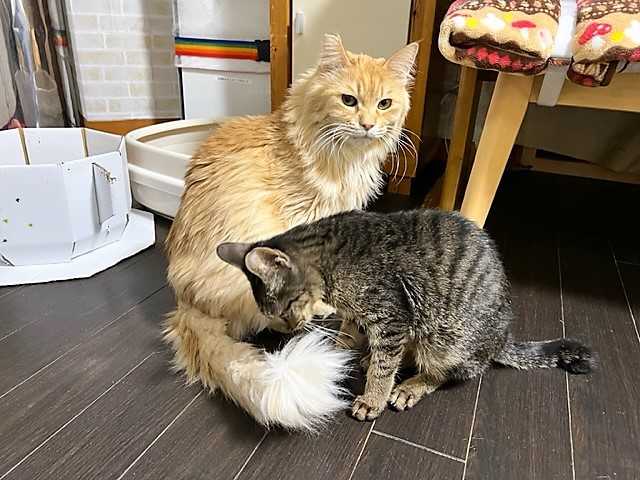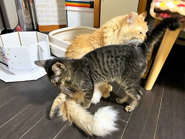 「しおん」のしっぽで遊ぼうとしている「よもぎ」