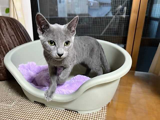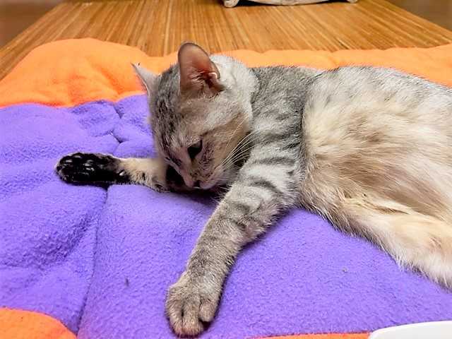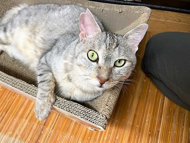 ウェットフードを食べた後、早速お風呂に。。。じゃなくて爪とぎベッドでくつろいでました。