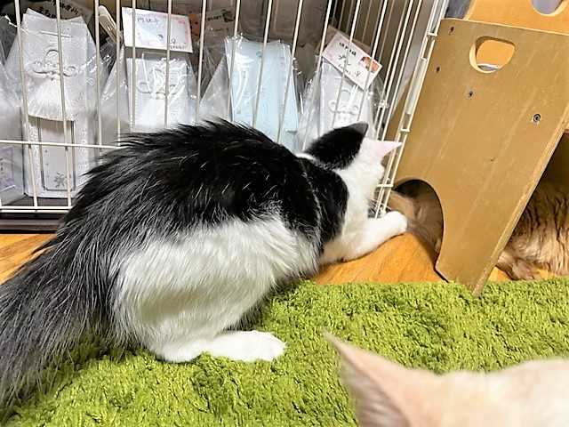 「こあ」が椅子の下にいる「マンボ」のしっぽで遊んでいました(*´ω`)可愛い~。