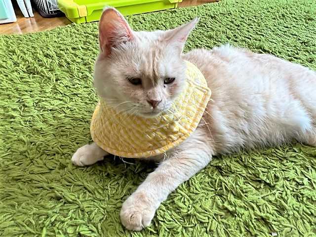 大好きなウェットフードを食べる時や、首周りのマッサージの時はエリカラを外してあげます。