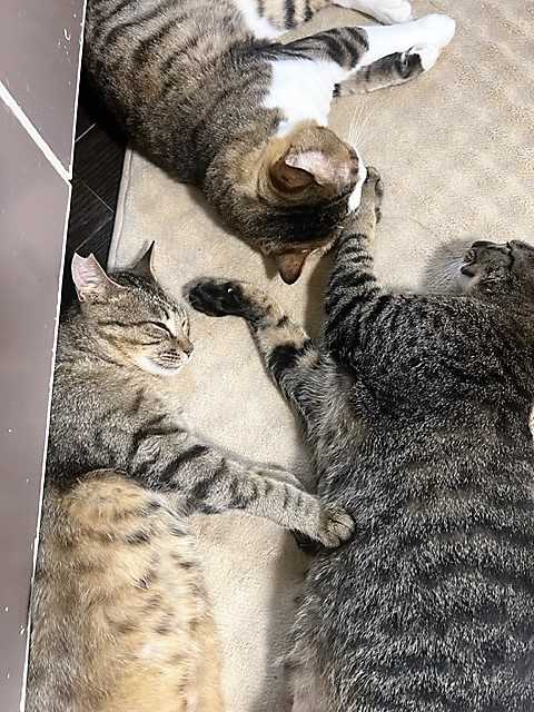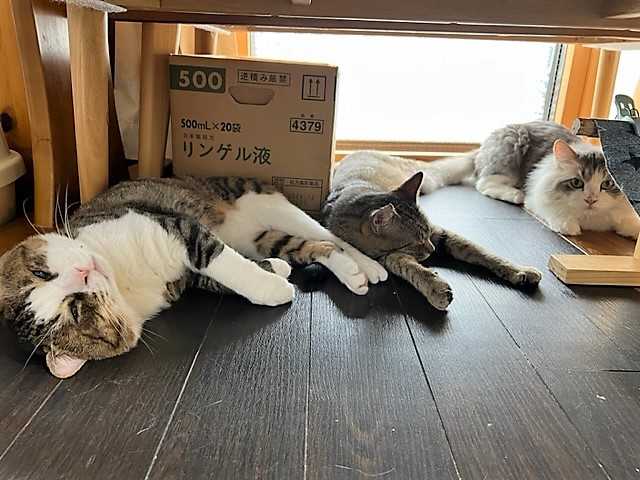 先週撮ったものですが、「よもぎ」と「甘太郎」と「ロト」がキッチンマットの上で仲良し寝していました♪