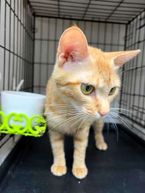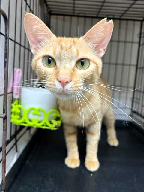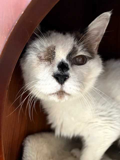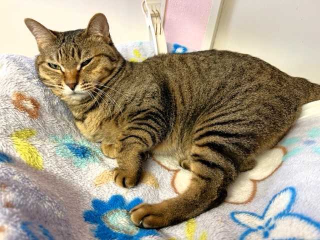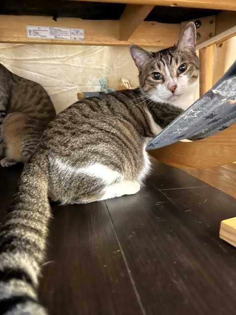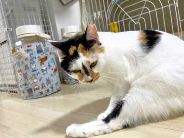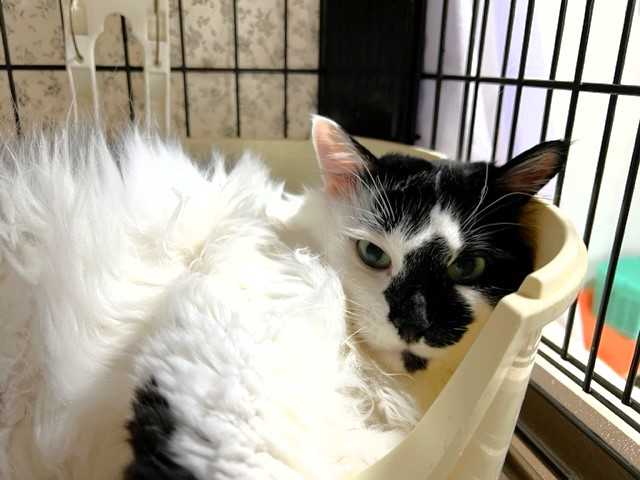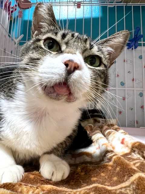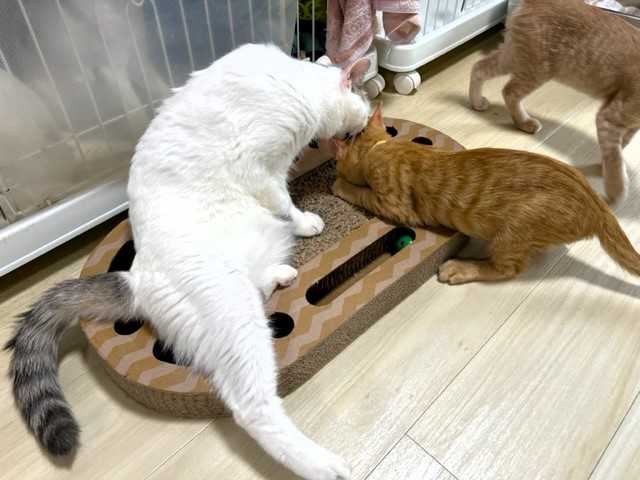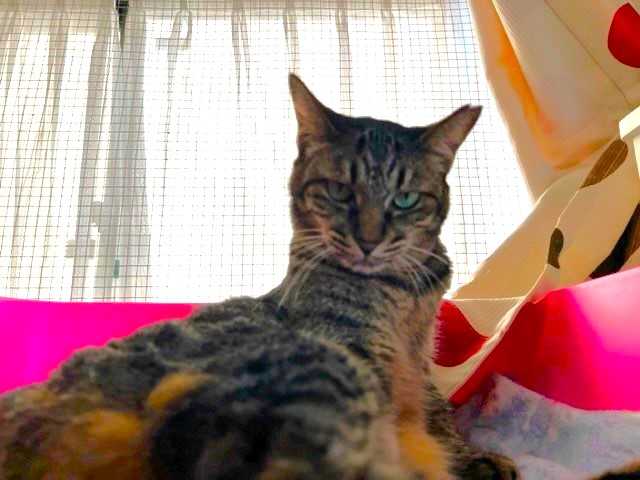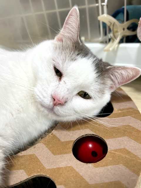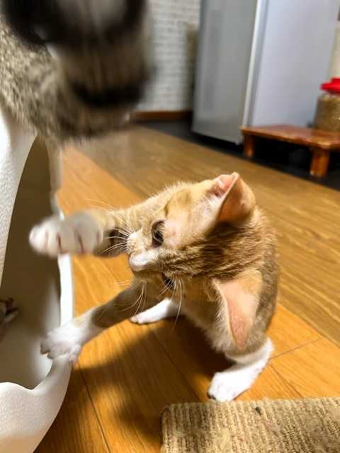 じゃらしで遊ぶ姿は仔猫みたいに愛らしいけど、お預かりさん宅へ行くまでシェルターにいたベビにゃん2頭(ロミオとプティ)の鳴き声を聞いて、母猫のような反応を見せていました。