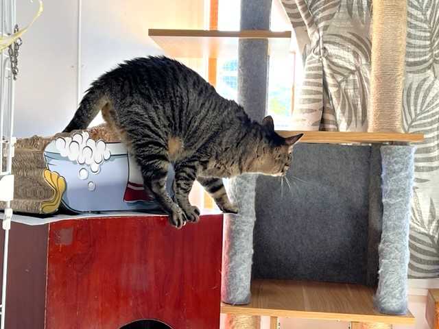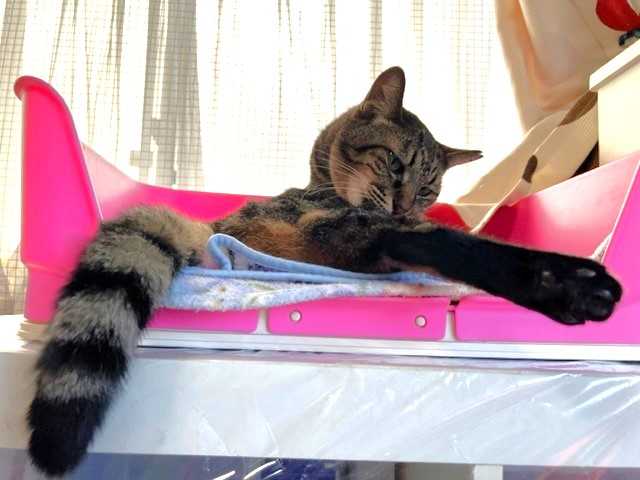 「よってぃ」がタワーのベッドでくつろいでいるところをパチリ。