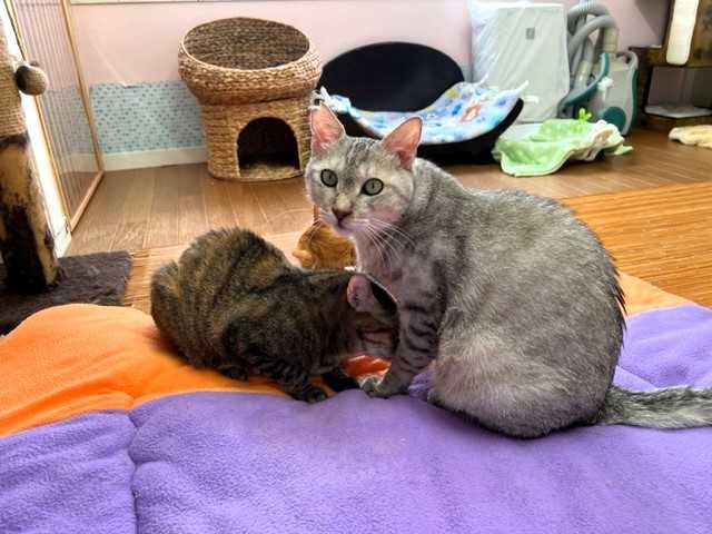 「リズ」は子猫たちにも優しいお姉さんで、「ぎゅうどん」のことをなめてあげていました。