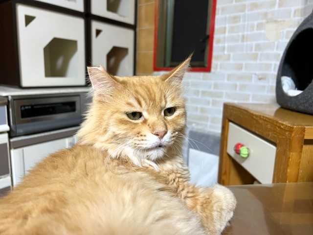 「ねむ」のお手入れ中をパチリ。面白い恰好をしていたのでそれを撮ったつもりが、よくわからないばかりかすごい目つきに撮ってしまいました(-_-;)