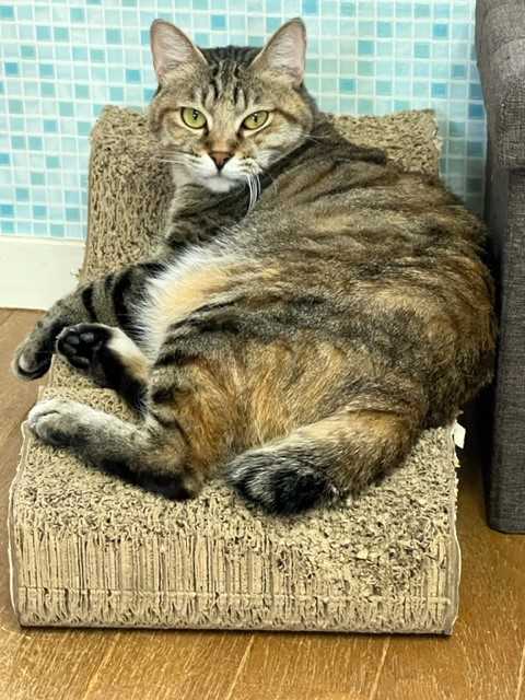 「しまちゃん」は爪とぎのボロボロ面の上でくつろいでました。