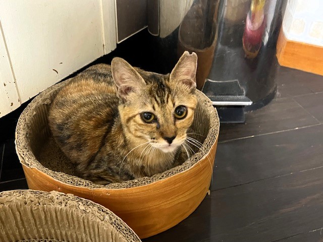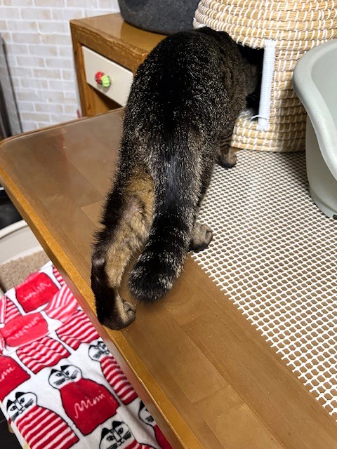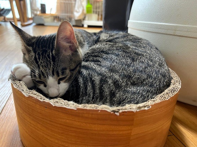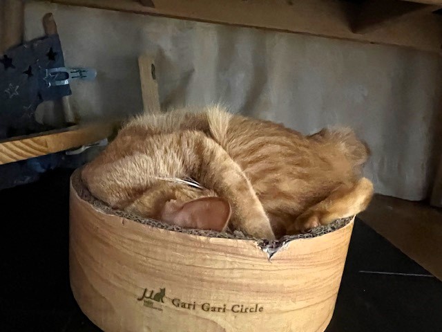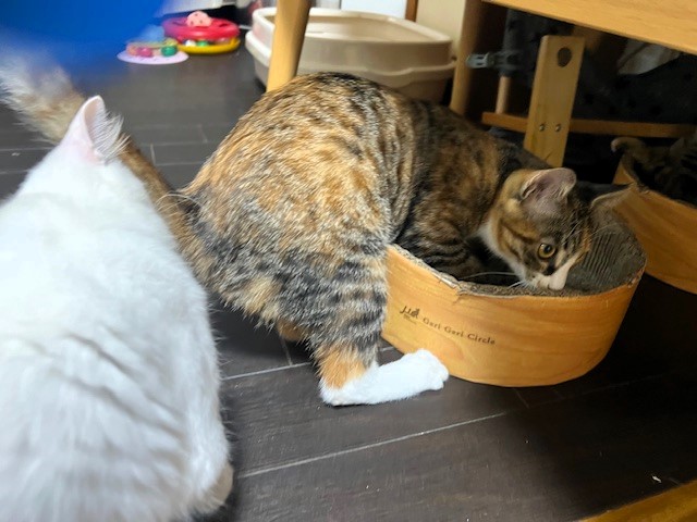 「ふくこ」が小さい仔猫用のサークル爪とぎにすっぽり。