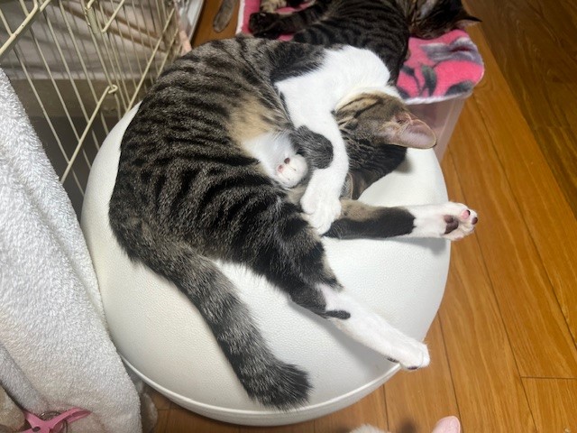 フリーで遊ぶ仔猫たちを眺めている姿は切ない。もうちょっとがんばろうね。