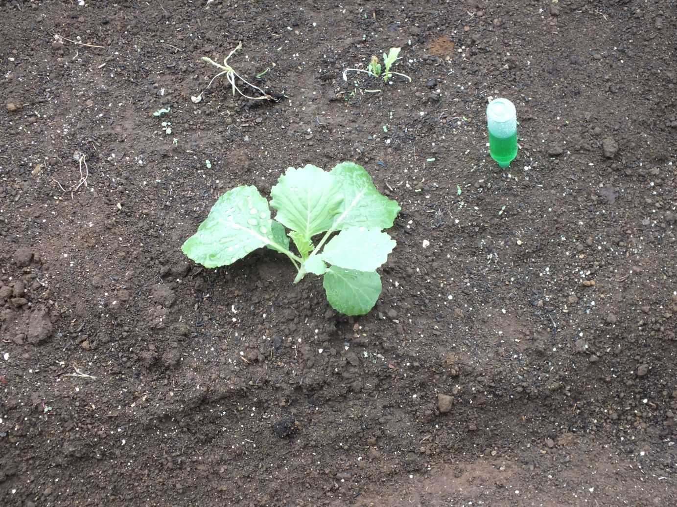 ​増設したキャベツです。初めの奴は植え替えた翌日へたっていた教訓から、植物活力剤 (100円ショップ製品) を早々に横にぶち込んでおきました。
