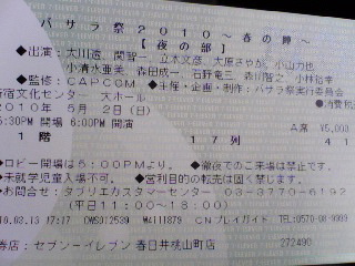 えへへバサラ祭のチケット、購入しちゃいましたvvvv あら?意外といい席??場所確認をしてないので分からないけど。1階の前の方の席みたいです~。あぁほんと・・・中井さんが居たらなぁ・・・最っっ高だったんだけどなぁ・・・!!ま、楽しんで来たいと思います。って、まだまだ先の話なんでづけどねーー5月だもので。失くさないようにしないと。午前中はスパコミに行って、バサラ本を漁って~~夜にバサラ祭に参加!!なんて充実した日になるんでしょう!!!懲りずに参加中。 ↓ブログランキング。