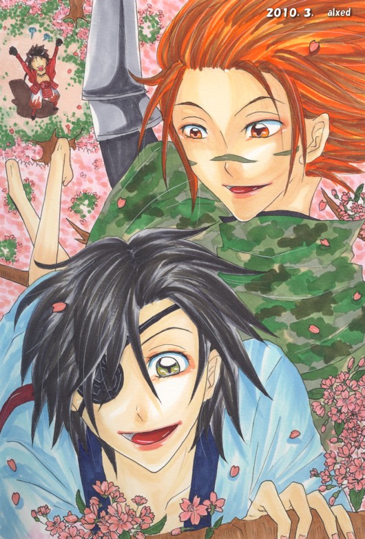 やっとTOPを春らしくすることが出来ました。今年は桜の開花が早いみたいで。ま、うちのとこのはまだまだ硬い蕾ですが・・・雨が降って暖かくなったら 一気に咲くんでしょうね。3月の終わりには満開になりそうだ。ってことで花見です。きっと佐助が政宗様を青葉城から勝手に連れ出したんだと思います。政(まつりごと)ばかりで、詰まんなさそうにしている宗様を屋根の上から見つけたんじゃないかな~それに遅れをとった幸村って感じで。私も木の上で花見をしてみたいよ~~~~!!!桜しか無くて、とっても綺麗なんだろうな。佐助~連れて行ってくれーー懲りずに参加中。 ↓ブログランキング。