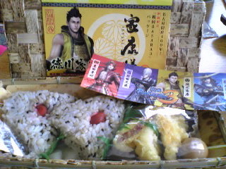 今日は名古屋の方の用事があったのでお昼にこんなのを食べてみました。家康膳。 こっちに用ある時に食べようって思ってたんだよね~。鷹狩りの時のお弁当をイメージしてるみたいで器がステキでした!こんな小さな器なのに、意外とたくさんの種類が入ってて・・・焼き味噌ってのが不思議だった。なんかサクっとしてて、お菓子みたいだけど、ご飯と一緒に食べると癖になる味でした。家康もこの焼き味噌と麦飯がお気に入りだったそうです。そして鯛の天麩羅。家康さんの大好物ですね~~~。他にも後10種類のおかずが入ってて美味しかった~~~!!名古屋の駅弁なんて、買うこと無かったからたまにはいいね。今度は信長御膳でも買ってみようかな~~。ま、コレのお目当てはバサラ3のステッカーってのもあるけど。宗様がステキ!!!あ・・・いつの間にか25万HItしちゃいました~~。ありがとうございます!!!懲りずに参加中。 ↓ブログランキング。