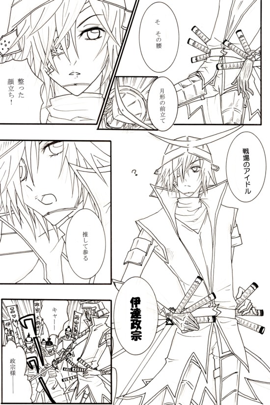 我慢が出来ずに描いてしまった。ジャンプSQの バサラ3の漫画ね。どーーーーーしても こーゆー風にしか見えなかったのーーー!!!この後に小十郎がバッサバッサとなぎ倒していけばいいと思いますvv小十郎まで描く気力は無かった・・・ごめんなさい。下書きを消してないから、汚いかもーー・・・サラリと横文字を使ってますが、気にしない。キャーキャー言っているのは敵側です。政宗様はアイドルだと 信じて疑わない!!懲りずに参加中。 ↓ブログランキング。