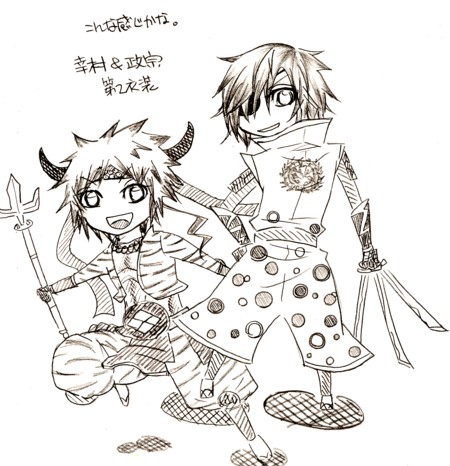 宗様と幸村の第2衣装を描いてみました。確かこんな感じで合ってると思うんだけど・・・。 宗様が宙に浮いているのは気にしないで下さい。やっぱ水玉模様は可愛い!!!何で色を紫にしたのかは不明だけど・・・。幸村は、小虎って感じか。今は家康をプレイ中。そして何気に2週目突入。その前に小太郎をプレイしなくっちゃ!!せっかく教えて頂いたんだし、早く佐助を仲間にしないとね~~~~vvvついでに幸村も。そして早くチカでプレイしたいんですけど、早くチカダテを拝みたいんですけど誰をクリアーしたら出てくれんのかしら??ま、片っぱしからやってけば出るんだろうけど・・・懲りずに参加中。 ↓ブログランキング。