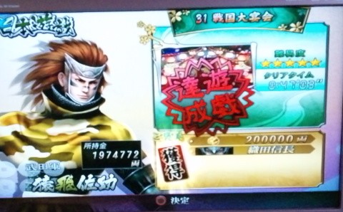 年末年始はお年賀に追われ、全然プレイ出来なかった宴。やっと出来るようになった~~~。まだ30武将全員天下統一してないしー3人組手もしてないし。日本遊戯だけはクリアーしました。連続で来る忠勝に何度も泣かされましたが・・・佐助と宗様で頑張っていただきました!! 頑張っては貰ったんだけど、すぐに2人ともドックンドックン言い出すから・・・2戦目あたりからずっと瀕死。後はずっっっとバサラケージが溜まるのを待ち攻撃、の繰り返し。宗様じゃすぐに避けられて、バサラ攻撃すら当たらなかったけど・・・ど、どーして避けるのぉおおおおお!?それが当たらなかったら何も当たらないじゃない!攻撃してもすぐにガードされ、あげくには反撃されちゃうし。宗様・・・なんて隙だらけなお人なんだ・・・佐助を見てみなさい。全く隙が無いわよ!!カウンター攻撃だってしちゃうんだからぁ!って事は、佐助が最強??信長様の攻撃すらカウンターで返してしまうものね。で、ちょっとずつ天下統一をクリアーしてって・・・ドリームチャァァンスしかやってないけど未だに的中率が低いのなんのって。絶好調なのに全く絶好調では無く。2戦目あたりにすぐに消え。最後に残るのは鶴姫ちゃんと孫市。この2人の確率がすんごーーーーく高いんですけど。今も鶴姫ちゃんが残りました。えっ、何もマーク付いて無かったんですけど?だからもう鶴姫か孫市に賭けるようにします。まつ 相変わらず使いやすいですね~~~。五郎丸の背中に乗って移動出来るのがいいわーー。カッコイイーーー!!殺傷能力が高いから、頼りになる武将がもう一人増えた感じ。いいわー。 まつを育てようかなぁ。五郎丸を出したまま入れ替えをすると、そのまま居てくれるんですね。わーーーー、五郎丸と宗様が一緒に戦ってる~~~六爪で戦うと、五郎丸と同じ戦い方になるね(笑)何だかとっても新鮮だ。熊と宗様・・・鬼に金棒? ↓ブログランキング。