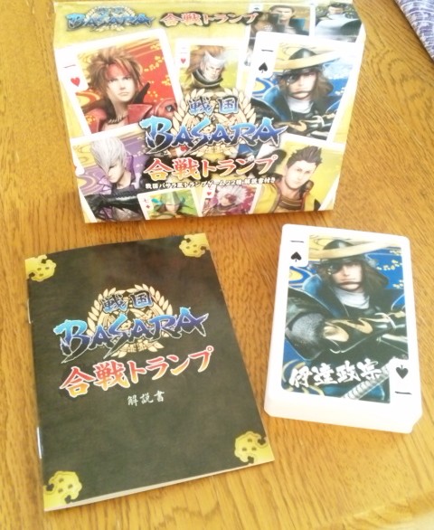 BASARAの合戦トランプ超カッコイイです~~~~!!!そうだよね、48武将(かぶり)も居るから一人一枚のトランプにもなるわな! トランプになってくれてありがとう!!折り曲がったりしたら怒るので遊べないけど観賞用として愛でさせて頂きやす!!もう1個手に入ったら実用用で遊べるんだけどな~~~。今日見たら売り切れだった。花札は山ほどあったので、また再入荷されるでしょう。BASARA風トランプゲームの説明書が入ってたけど題名が変わるだけで、普通のトランプゲームと一緒です。私個人的には「捨て駒並べ」がやりたいな~~要するに七並べなんだけど、七並べ風なので。(笑オーナーを大将、プレイヤーをつわもの(兵)と呼ぶのがステキ。捨て駒並べでは、パスをする時には「日輪よ!」と言わなきゃいけないし一番早く上がった人は「兵など所詮 捨て駒よ!」と言って勝利。など、セリフを言わなきゃいけないところがステキvvvBASARAファンじゃないと盛り上がれないこのトランプがステキ!!一緒にパーリィしようぜ! ↓ブログランキング。