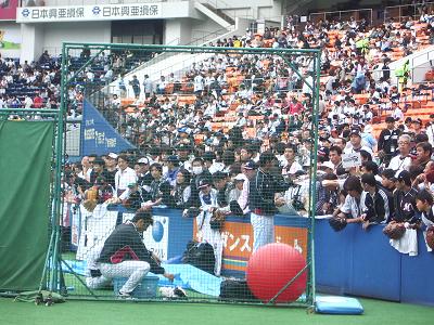 いつも客席側からみているとわからないのですが、選手側からみると上の写真のような感じになります。選手たちは、ちょうど体を作っている中継ぎ陣達です。先発陣で試合に出ない成瀬、渡辺俊、清水あたりはやはり気が楽なのかダラダラっとした感じでした。とにかく凄い、、、、
