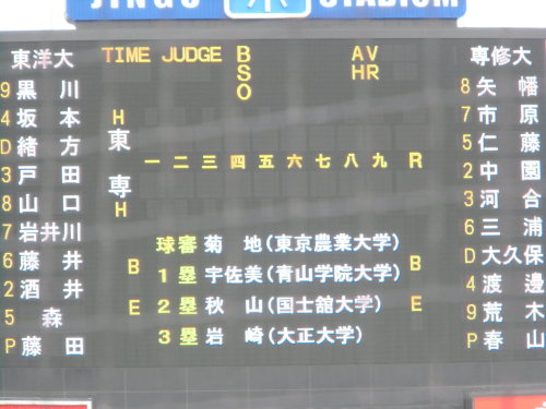 ■今日(11月3日)、東都大学リーグ1・2部入替戦の第1回戦が行われた。対戦カードは今季1部最下位の東洋大と、2部優勝の専修大。(写真)スタメン1部を最下位で終え入替戦出場を余儀なくされたチームの緊張感は半端でないと聞く。もし敗れて2部に落っこちたら? とりわけ4年生はOBや関係者、そして後輩たちへの申し訳なさや不安が一杯になって、試合前の挨拶時は足がガチガチと震えるものらしい。■以前そんな話を聞き、ボクはすっかり入替戦フリークになった。断崖絶壁に立たされた気持ちでプレーする野球は、プロ野球を含めそんなに多くない。高校野球のトーナメントもそれなりに緊張感を伴うが、それは前に勝ち進むためのもの。それに対して、入替戦はやらなくてもよかった試合を、無理やりやらされる後ろ向きなものだ。 それが決定的に違う。そんなわけで、ボクは何度も交流戦を見てきたが、1部最下位だったチームが入替戦に臨むとき、ひとつだけ共通点があると思っている。それは試合前のキャッチボール等の練習では、どの選手も笑顔かつ大きな声を張り上げていること。「俺たちは1部で戦ってきたんだ。お前ら(2部優勝チーム)とは格が違うんだよ、格が・・・」とでも言いたげに、相手に余裕の姿を見せるのだ。本当は強烈な緊張で、ココロが圧し潰されそうであったとしても。(写真)試合前の整列、挨拶。背中が東洋大。足はガチガチ震えていたか?■ところが、だ。試合前の東洋大の練習にはそれがなかった。とても静かに、そして淡々と練習をやっていた。その理由はこれまで見てきたチームと違い、数々の栄冠を勝ち取ってきた名門・東洋大ゆえの余裕なんだろうと、ボクは好意的に解釈した。それが試合が進むうち、まったくの誤解だったことに気づいた。リーグ戦で負け癖がついてしまい、この試合ではカラ元気を出す気力さえ残っていなかったのだ。まるで東洋大ナインには元気も、余裕も、かつての自信も見られなかった。一応9回まで野球をやってはいたが、東洋大の敗戦は序盤に決まっていた。東洋大 100 010 020 =4専修大 031 010 00X =5(東)●藤田-土肥‐佐藤翔、(専)○春山‐大野■それは2回裏のことだった。1点差を追う専修大の攻撃、二死一・二塁の場面。9番・荒木翔平(2年、横浜高)がカウント2-2から放った打球は高く、そしてふらふらと上空に舞った。平凡なライトフライか? ボクにはそう見えたが、ライトは慌てたようにフェンスに向けて走り出し、そして後ろを向いて打球を見送った。打球はスタンドの最前列あたりに落ちて、ポーーーンと大きく跳ねた。逆転の3点本塁打!!!非力に見えた荒木の、よもやの一発。この本塁打で「流れ」は完全に東洋大の手を離れた。リーグ戦で自信を失っていた東洋大は、ツキからも見放された瞬間だった。専修大はその後も3番・仁藤敬太(4年、常葉橘高)の2打席連続適時打で突き放しに成功した。東洋大は専修大を追いかけるだけで精一杯。2番・坂本一将(4年、浦和学院高)、3番・緒方凌介(4年、PL学園高)たちが辛うじて意地を見せたものの、最後まで「流れ」を手繰り寄せることはできなかった。(写真)専修大・荒木。この試合では3点本塁打を放ち、ラッキーボーイに。■今日の敗戦で、東洋大は断崖絶壁に立たされた。もう後がない。明日2回戦に向けての好材料もツキもない。評論家なら「開き直って!」とか言うのだろうけれど、何をどのように開き直ればいいのだろうか。ボクには見当がつかない。ヤバいぞ、東洋大!今日も1クリックお願いします