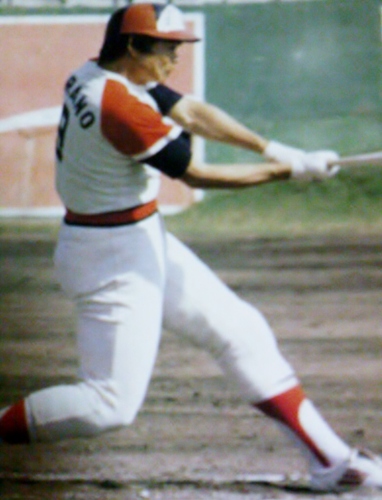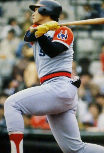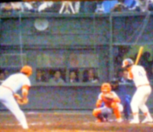 (前回の続き)■1979年11月4日(日曜日)、日本シリーズ第7戦。9回裏、1点差を追う近鉄バファローズは無死走者一塁のチャンスをつかんだ。広島 101 002 000 =4近鉄 000 021 00 =【近鉄メンバー】1(6)石渡 茂2(3)小川 亨3(9)チャーリー・マニエル4(7)栗橋 茂 → (PH)(2)梨田 昌孝5(2)有田 修三 → (7)池辺 巌6(5)羽田 耕一 → (PR)藤瀬 史朗7(4)クリス・アーノルド → (PR)吹石 徳一8(8)平野 光泰9(1)鈴木 啓示 → (PH)阿部 成宏 → (1)柳田 豊 → (PH)永尾 泰憲 → (1)山口 哲治 → (PH)佐々木 恭介■江夏豊は安打を羽田耕一に安打を打たれ、ガクリと膝を落とした。バッテリーを組む広島・水沼四郎捕手は、江夏のこの1球目を悔いた。「スルスルーと入ってくる、力のないストレート。やばい!と思った瞬間、打球はセンターへ。江夏にはひとつだけ欠点があった。それは一発の可能性が低い打者に対し、ごくたまに、打ちごろのストレートを投げてしまうこと。この球もそうだった」と。この江夏の1球目は、近鉄に願ってもないチャンスを呼び込んだ。しかも走者は足のスペシャリスト・藤瀬史朗である。送りバント、盗塁、ヒット・エンド・ラン、バスター、なんでもできる場面。近鉄の揺さぶりが始まった。広島の内野陣はマウンド付近に集まり、投球、そしてポジションの確認をした。■近鉄・西本幸雄監督が打席に向かうクリス・アーノルドを見上げて、強い口調で話しかけた。後になってわかったことだが、これはヒットエンド・ランのサインの確認だったに違いない。通訳を介して西本の指示を聞くアーノルドの表情は硬い。■江夏豊「まず送りバントで同点を狙ってくるだろうと思った。ただアーノルドはバントが得意か? もしくはヒットエンドランか? 閃きというか考えが一瞬のうちに頭の中をまわったよね」。さらに「藤瀬の足はたしかに速いよ。オレの癖も見抜かれてるやろ。そんなら走ってもかまへん。そう思った。それよりバッターに集中したほうがいい」。水沼四郎「9回のこの場面、盗塁の可能性はあるのか。近鉄は危ない賭けをするのだろうか。近鉄ベンチを見渡し、ランナーを見て、何か動きがあるかを探ってみることにした」三度、四度、五度、アーノルドは素振りを繰り返した。<2球目> 外角高めに大きく外れたシュート。ボール。カウント0-1。広島バッテリーは近鉄の動きを見るために初球を外した。アーノルドは平然と、そのボールを見送った。(写真)打者はアーノルド。投手・江夏、捕手・水沼『近鉄バファローズ球団史』ベースボール・マガジン社刊■クリス・アーノルドは、1980年に近鉄退団後、米国選手を日本球界に紹介する代理人に転身した。タフィ・ローズの近鉄入団も、アーノルドの仲介による。今日も1クリックお願いします