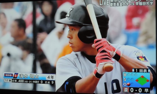 昨季「慶應・清水翔太に注目!」と記事を書きましたが、ついにこの秋、清水翔太(4年、桐蔭学園)が首位打者そしてMVPのタイトルを獲得しました。4番・岩見雅紀に注目が集まりがちでしたが、優勝した勝因はそのあとを打つ5番・清水の活躍にあったに違いありません。4番を引き立てるには、5番の役割は重要です。そうです、ボクが5番打者のしんどさに気づいたのは巨人V9の頃でした。末次、柳田、国松、黒江などONの後を打つ5番打者は本当にコロコロと変わりました。ちょっとやそっとでは5番の役目を果たせないのです。従い、清水の活躍は見事というほかありません。(写真)10月28日早慶1回戦。この直後に先制となる2点適時打を中前に放つ ~BS朝日~首位打者を獲った清水を契機に、かつての東京六大学の首位打者を調べてみました。清水の今季記録(打率.480)を超える打者は想像以上に多くいました。例えば5割超の主な打者では、昭和36春 榎本博明(慶) .517昭和47春 長崎慶-(法) .511平成8春 高橋由伸(慶) .512平成13秋 喜多隆志(慶) .535平成26秋茂木栄五郎(早) .514眺めていて慶應の選手が多いなぁと。歴代最高打率(.535)も慶應の喜多隆志。あの智辯和歌山卒でロッテに行った巧打者ですよね。そしてボクの目についた法政・長崎慶一は、昭和47年に首位打者s翌シーズンも2季連続で首位打者を獲得したことを知りました。長崎慶一さん(北陽ー法政大、のちに大洋、阪神)。ボクが思い出すのは彼の大洋時代のこと。昭和57年、田尾安志との首位打者争いは「敗退行為」と揶揄されるなどあって、とても後味の悪いものでした。長崎さんに何の責任もなかったのに。そして今から10数年前、都内のリトルシニアのチームを率いて、よく埼玉・大宮のグラウンドで指導されていた長崎さんの姿を思い出しました。(写真)法政大時代の長崎慶一さん ~『東京六大学野球80年史』(ベースボール・マガジン社)~そして長崎さんをwikipediaで調べていると、大洋時代の指導者は「青バット」の大下弘さんだったとか。大洋の同僚・山下大輔とともに大下さんから指導を受けていたそう。大下弘さん(高雄商ー明治大、のちにセネタース、西鉄など)。戦前は明治大の下級生だったため球拾いばかりで、東京六大学の公式戦に出場経験はない模様。戦後に復学した際、明大グラウンドで大飛球をポンポン打ち上げる大下に横沢三郎(戦前のセネタースで活躍した明治大の先輩)が目をつけて、大下さんを職業(プロ)野球の世界に導いた。昭和20年秋、戦後初のプロ野球「東西対抗戦」を控えて次々と元プロ選手たちが復員し練習のため大宮のグラウンドに集結する中、大下さんの長打力を見て目を丸くしたそう。「いったいあの打者は誰なんだ?」と。そして同年11月23日、神宮球場で東西対抗戦が開催され、東軍の5番打者として彗星のごとくデビューした大下さんは、後に日本の野球ファンに「ホームラン」の素晴らしさを伝える伝道師になることは、この時点で誰も気づいていませんでした。(写真)西鉄ライオンズへ移籍直後の大下弘さん ~『激動の昭和スポーツ史』(ベースボール・マガジン社)~