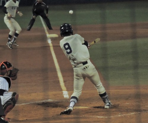 寒かった、ほんとに寒かった。試合開始は夕方4時。直後に陽が沈み4回頃には北風が強く吹き始めた。と同時に、試合が動きました。東 010 200 100 =4亜 000 020 100 =3その4回表、強い北風が亜大投手陣を混乱に陥れました。スコア0-0、東洋大二死満塁の好機に、9番・宝楽健吾(4年、PL学園)がレフト線にライナーの二塁打を放ち、先制点を挙げました。しかしこの回の安打は、宝楽の一本だけ。あとは亜大投手陣から与四死球4つの大盤振る舞い。結局亜大は、この回を終わらせるために計3人の投手を費やしました。ボクはあまりの寒さのため5回に球場を後にしましたが、この宝楽の一打が東洋大を勝利に導いた模様。今季限りで引退する高橋昭雄監督のリーグ戦最終試合に花を添えました。(写真)4回表、二死満塁の場面で東洋大の9番・宝来健吾が左翼線に2点適時打を放つ。