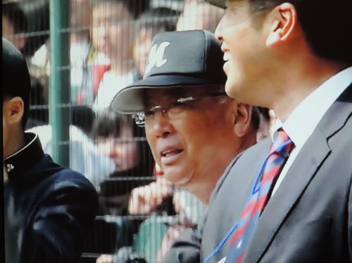 どちらに勝利の女神がほほ笑むか、終盤までまったく予想できない好ゲームでした。そして、スコア3-3の同点で迎えた9回表、ついに試合が動きました。聖光学院の攻撃。一死後、9番・高坂右京が外へ逃げるシュートを左前に流して出塁すると、続く1番・田野孔誠が三塁側にセーフティバントを敢行。しかし東筑の三塁手がこれを一塁へ悪送球し、聖光学院は一死二・三塁の願ってもないチャンスをもらいます。打席には2番・横堀航平。1ストライク後の2球目。ここで解説の大矢正成さんは「ここはね、スクイズも頭に入れておいたほうがいいですね」と言った瞬間、まさに横堀はバットを寝かせてセーフティスクイズを。慌てた一塁手が(二塁手がカバーする)一塁べースへ悪送球して2人の走者が相次いで生還、結局この2点が決勝点になりました(最終スコア:聖光学院5-3東筑)。大矢さんの指摘どおり、どうしても1点が欲しい終盤はスクイズが常套手段。なのに東筑バッテリーはまったくの無警戒。簡単にストライクを取りに行く姿は、まだ「試合勘」が目覚めていないように見えました。これが春(センバツ)、しかも開幕戦ゆえの宿命なのかもしれません。昨年夏、NHK『ドキュメント72時間』は、東筑高を熱く応援する地元の人々を活写していて、その影響もあり東筑の快進撃を期待しましたが、残念ながら初戦で敗退してしまいました。一方、聖光学院の斎藤智也監督は試合後のインタビューで、9回のスクイズの真相を聞かれ「〇凹◎▼×・・??!」とまったく意味不明な返答をしていました。今後の戦いに備え、敢えて煙に巻いたものと想像します。全国制覇を目指す聖光学院、こちらは早々に「試合勘」全快のようでした。(写真1)試合終了後、インタビューを受ける聖光学院・斎藤智也監督。インタビュアー(左)の質問が結構鋭かった。(写真2)解説の大矢正成さん。残念ながらこの人を神宮で見た記憶はありません。80年代前半、法政大の捕手といえば木戸克彦さんでした。あまりにもライバルが偉大すぎた・・・(写真3)この東筑のバッグがいいですねぇ。モデルは東筑・青野浩彦監督。※写真はすべてNHK。