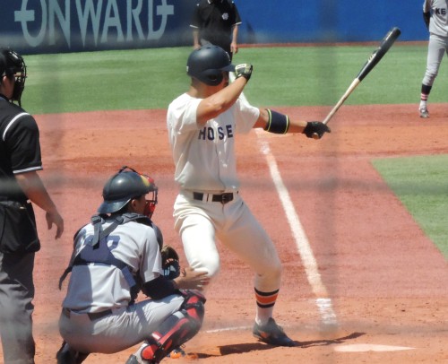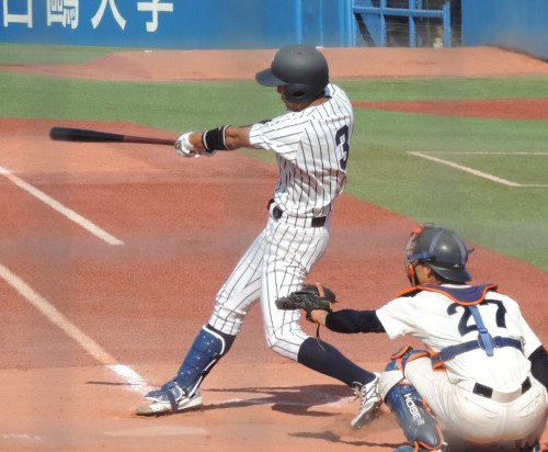 今日行われた立教大ー法政大の1回戦は、立教が3-2で先勝し開幕以来3連勝。春連覇に向けて快調な滑り出しを見せました。一方の法政は、開幕戦に白星を挙げることはできませんでした。今日も大阪桐蔭OBたちが躍動しました。まずは立教、2回裏の攻撃。この回先頭の4番・三井健右(大阪桐蔭)が1ボールの後の2球目をフルスイングすると、打球は高く高く舞い上がってライトスタンドへ。滞空時間のとても長い本塁打、この豪快な一発がチームに勢いをもたらしました。2試合連続の2号本塁打。187cm、87kgの巨漢、左打席の立ち姿には「雰囲気」が漂います。まだ2年生、これからが楽しみです。投げてはエース・田中誠也(3年、大阪桐蔭)が相変わらず小気味よい投球で法政打線を翻弄、7回を無得点に抑えました。一方の法政は、9回、代打で登場した福田光輝(3年、大阪桐蔭)が2点本塁打を放って一矢報いましたが、時すでに遅し。開幕戦を白星で飾ることはできませんでした。悔やまれるのは4回、無死二塁の場面、中途半端な攻めで好機を逸したこと。打者は送りバントの構えで初球のボール球をファール、2球目も送りバントの構えだったがストライクにもかかわらずバットを引き、あっという間に0-2に追い込まれ、結局その後は策なく三振に倒れました。また主砲・中山翔太(4年、履正社)に2本の長打が出たものの、いずれも走者なしの場面では得点力が半減します。1番から3番までのテコ入れが必要なんでしょう、きっと。(写真1)立教大・三井健右(写真2)立教大・田中誠也(写真3)法政大・福田光輝が9回、2点本塁打を放つ(写真4)スコア(写真5)大阪桐蔭時代の三井健右。2016年夏の甲子園2回戦、対八戸学院光星(NHK)
