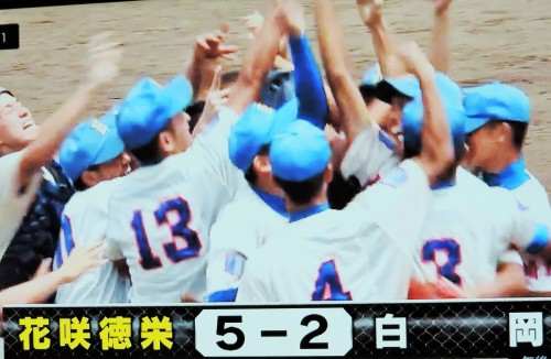 ■今日行われた決勝戦は、花咲徳栄が白岡を下して優勝、甲子園出場を決めた。8回を終わってスコア5-1。花咲徳栄の楽勝と思われたが、白岡は9回に粘った。1点を返しなおも2死満塁。本塁打が出れば逆転の場面を作った。ここで3年生エースの鎌倉から2年生の左腕・高橋に継投し、辛くも花咲徳栄が逃げ切った。(写真)優勝を決めた花咲徳栄ナイン。~テレビ埼玉より。■そして優勝決定後のインタビュー、花咲徳栄・岩井隆監督のコメントが面白かった。いきなり「昨夏は開会式直後の試合で敗退して、一番短い夏でしたが」と聞かれ、「はい、今年は一番長い夏になったので、昨夏のことはどうかチャラにしてほしいと・・・」と言って頭を掻いた。いったい誰にチャラにほしいと懇願しているのか(笑) きっと学校関係者やらOBやらに言っているのだろうけど、いきなりこんな質問がくると思っていなかったろうから、つい本音が出ちゃったんでしょう。きっと昨夏の敗戦後にはいろんなことがあったに違いない!(写真)優勝決定後、インタビューに答える岩井隆監督。~テレビ埼玉より。■岩井隆監督(桐光学園ー東北福祉大)。思い出すのは2003年のセンバツ、東洋大姫路との延長引き分け再試合だ。この時、徳栄のエースは福本真史(現・花咲徳栄高コーチ、明治大)、東洋大姫路高のエースはグエン・トラン・フォク・アン(元東芝野球部)だった。NHK『高校野球100年のものがたり~埼玉編』には取り上げられていなかったけれど、これも名勝負だったと思う。ちなみに岩井さんの東北福祉大時代の同期には、金本知憲、斎藤隆、浜名千広らがいた。 (写真)2003年、花咲徳栄と名勝負を演じた東洋大姫路・アン投手。~『忘れじの甲子園』(ベースボール・マガジン社より。 <関連記事>東洋大姫路・アン投手 http://plaza.rakuten.co.jp/amayakyuunikki/diary/200612170000/ 告!当ブログは「野球ブログ瓦版」に参加しています。もしよろしければ、下記のサイトもご覧ください。こちら→ http://kawaraban.blog.jp/