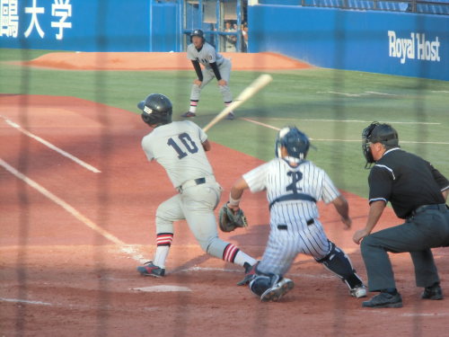 (1年、興南高)は左前に今日2本目の安打を放ち、立教は1点を返す。さらに4番・加藤の内野ゴロの間にも1点を返し同点に追いつくと、6番・大塚拓の左前適時打で逆転に成功した。
