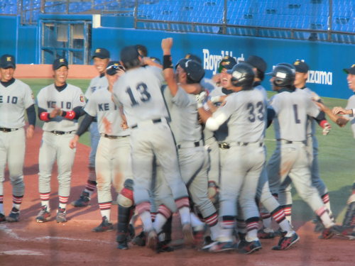 ライトフライか? 初めはそう見えたが打球は意外に伸びて、なんと最前列にスタンドイン。慶応の勝利を決める貴重なサヨナラ本塁打になった。![]()