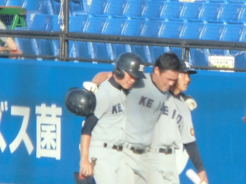 ■ただ慶応にとって喜んでばかりいられない事態が起きた。それは8回裏のこと。一死二・三塁のチャンスに、福谷は遊ゴロを放って一塁に全力で駆け込んだ際、ベースを踏んだ直後に倒れこんでしまったのだ。