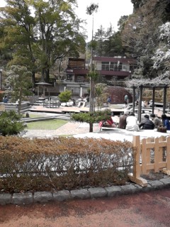足湯の横を通過してみました。春休みということもあり、人が多かったです。