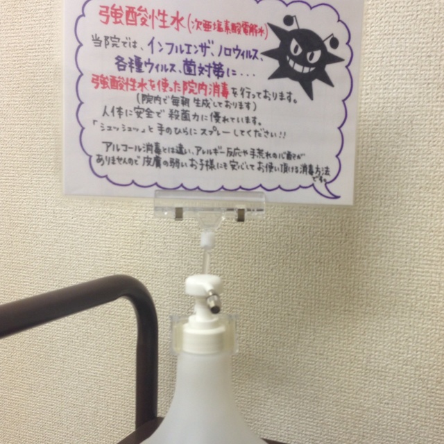 雨宮整骨院では、 インフルエンザ*ノロウィルス対策として、 次亜塩素酸ナトリウムによる、 うがい・手や指消毒・加湿を 徹底しております^ - ^ 安心して、ご来院くださいm(._.)m