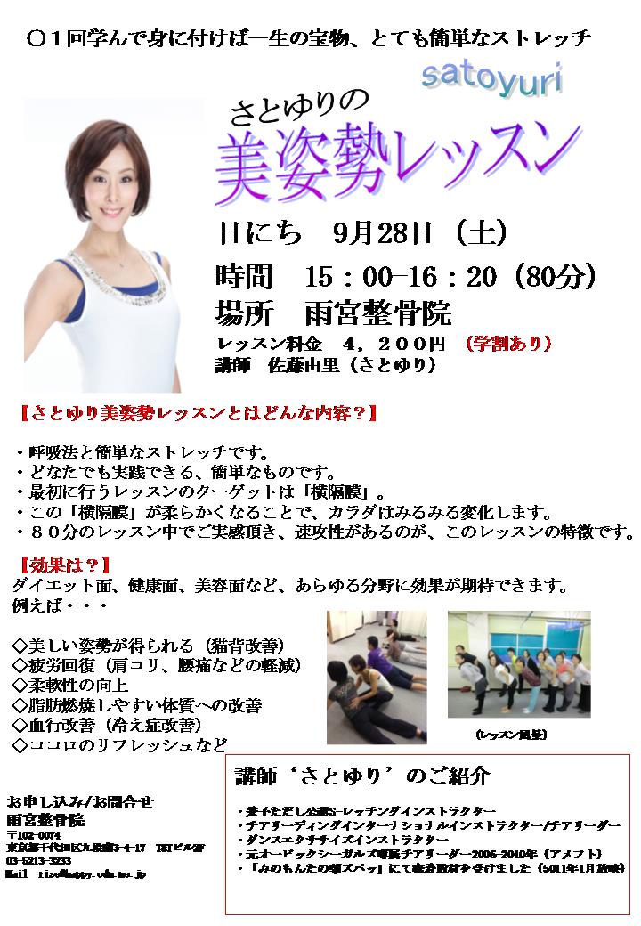 9月7日(土)雨宮整骨院にて「さとゆり美姿勢レッスン」を開催いたします!!4回を数えます。レッスン!!回を重ねるごとに、充実した楽しいレッスンとなってまいりました!!残暑の残る9月です。夏バテ解消にご参加ください(^O^)寄り駅 市ヶ谷 九段下 半蔵門 飯田橋 四ッ谷自賠責保険 交通事故 交通事故治療 むちうち むち打ち症 労働災害 通勤災害 労災 オアシスO2 高気圧 酸素カプセル肩こり 腰痛 腱鞘炎 疲れ 癒し 五十肩 整骨院 接骨院 整体 カイロプラクティック 整形外科 マッサージ 指圧 鍼灸 トレーニング ジョギング ウォーキング ノルディック NW 痩身 ダイエット 細マッチョ 足やせ 小顔 長寿 エイジング アンチエイジング 加齢防止 美肌 美姿勢 Sレッチング さとゆり