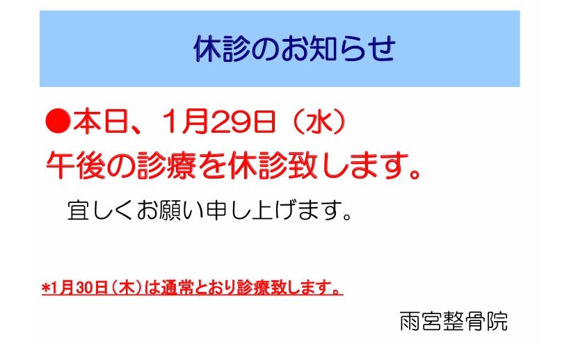 本日、1月29日水曜日 午後の診療をお休みします。 大変、ご不便をおかけしますが、 よろしくお願い申し上げます。 ※なお、明日の1月30日木曜日は、 通常通り診療いたします。 寄り駅 市ヶ谷 九段下 半蔵門 飯田橋 四ッ谷 自賠責保険 交通事故 交通事故治療 むちうち むち打ち症 労働災害 通勤災害 労災 訪問マッサージ 鍼灸 不妊治療 高齢者福祉 保険治療 オアシスO2 高気圧 酸素カプセル 肩こり 腰痛 腱鞘炎 疲れ 癒し 五十肩 整骨院 接骨院 整体 カイロプラクティック 整形外科 マッサージ 指圧 鍼灸 トレーニング ジョギング ウォーキング ノルディック NW 痩身 ダイエット 細マッチョ 足やせ 小顔 長寿 エイジング アンチエイジング 加齢防止 美肌り