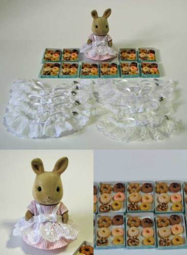秋のバザーに向けてシルバニア服をつくっています。女の子用のエプロンと、粘土のドーナツのセットが10組できあがりました。 クリックで大きくなります↓ 以前からシルバニア服と粘土小物をセットにしたいと思っていたのがやっと形になって嬉しいです(*^_^*)お人形が着ているワンピースは付きません。