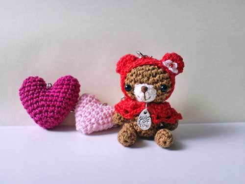 いつもと違うクマさんを編んでみたくなってずきんをかぶったクマを編んでみました。ハートと一緒にストラップ仕立て。 苦手な鼻の刺繍もがんばりました(*^_^*)