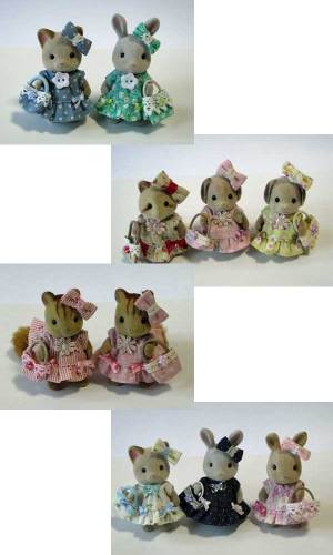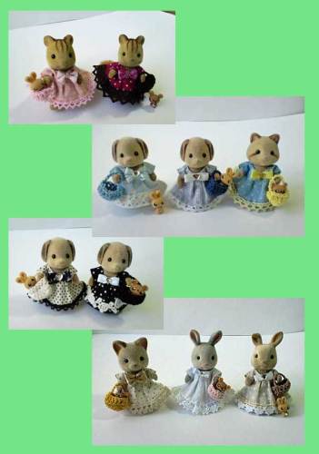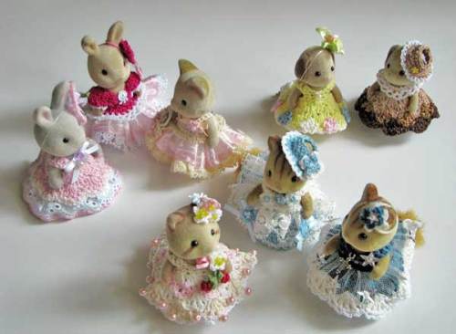 バザー用のシルバニア服をつくっています。バザーもだんだん近づいてきました。今年は少ししか出せそうもないなぁ。。。端っこのほうでひっそりと販売しますね(^_^;) 今日はドレスをお披露目します♪ 我が家の女の子たち(もとは男の子だった子も!?)全員で記念撮影しました。なりきりお姫様たち、王子様がいないのが寂しいですね。すてきな王子様の衣装もつくれればよいのですが、男の子の服は難しくて(^_^;) こちら(↓)は職場のお友達のお子さんにプレゼントしたものです。 今回はちょうどバザーのためにドレスを作っていたのでドレス系ばかりになってしまいましたがまた今度、木綿の普段着を縫ってあげたいです。