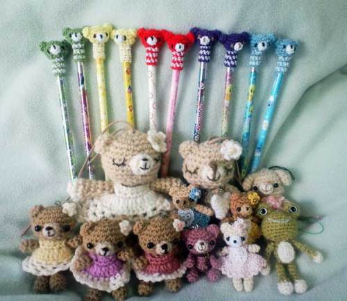 いよいよ明日はバザーです。編んであった あみぐるみにストラップや紐をつけました。後ろに並んでいるのは 「えんぴつクマ」です。子どもたちが小学生のころ買って眠っていた鉛筆にチビくまをつけてみました。キャップにすると芯が折れてしまうので飾りです。 ちょっとした空き時間に何かつくりたくなったとき、ちょうどいいのが 髪かざり。前にも持っていきましたが またつくったので追加です。 子どもたちが楽しんで買い物してくれるといいな♪「わたしもつくりたい!」って思ってくれたら もっと嬉しい。子どもたちの母校の小学校のPTAバザーにいまだにかかわっているのは何かつくっていたくて仕方ないから。わたしのつくったものを並べるのにピッタリなのが小学校バザーだから。 ボランティア? えらいね~、なんていわれるけれど楽しませてもらっているだけなのです(*^_^*)
