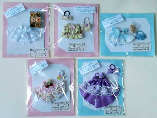バザー用のシルバニアの服、今年は50着を目標につくっていました。自分ノルマを達成したのでお披露目です 得意の簡単ワンピース 10着。リポンの耳飾りと籠入り粘土マスコットをセットにしました。 こちらも毎年つくっているサテンドレスとリボンのセット。 以上20着と前にブログでご紹介した ニットのお洋服(11着ありますがこのうち10着) ローウエストのワンピース エプロンとドーナツのセット合計50セットです。 今年は以前からやってみたかったシルバニア服と粘土小物のコラボもできて楽しかったです。折角だからラッピングも可愛くしたいな